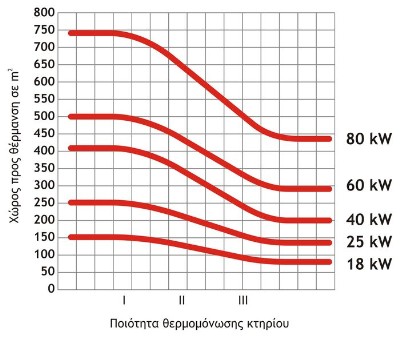 Χρησιμοποιούμε το διπλανό διάγραμμα για να επιλέξουμε την κατάλληλη ισχύ λέβητα για τις θερμαντικές ανάγκες του χώρου μας.